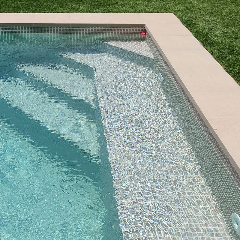 Posteriormente, toda la estructura —tanto los paneles existentes como la nueva escalera de obra— fue revestida con lámina armada de alta resistencia. Este método sella completamente la piscina, ofreciendo una estanqueidad total que los paneles por sí solos no garantizan. Además, el resultado estético es moderno y la entrada mucho más confortable y segura.